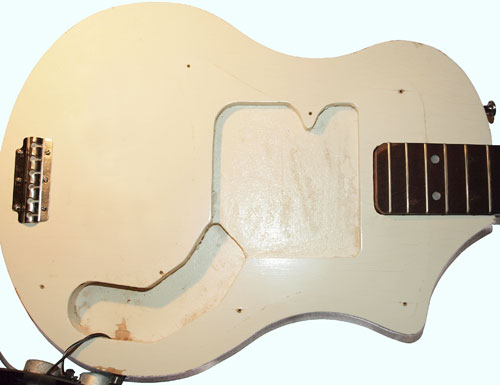 The is a very simple guitar indeed, with a thin, lightweight laminate wood body with only the most basic of routing; the route has rounder edges than the squarer route of the later Stroller, but is broadly similar, capable of holding one or two pickups, and therefore suitable to be the body of a Vox Stroller or a Vox Shadow. The simple electronics are also much the same, with a coaxial output jack (in this example changed to a regular guitar jack).