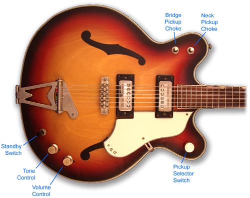 The two switches on the top bout are tone chokes. When flicked downwards, a capacitor is activated that cuts some of the lower frequencies of the pickup, giving a very clear, bell-like tone. The diagram below shows the other controls: volume, tone, standby switch, and pickup selector.