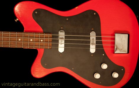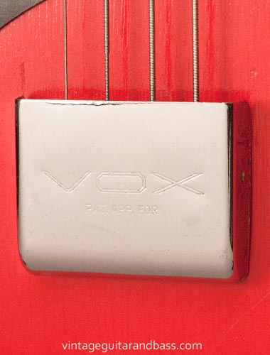 Vox V1 single coil units with chrome plated, Vox-emblazoned covers. Later examples of the Clubman bass had just one, or no Vox logos on their covers. Compare this bass with a