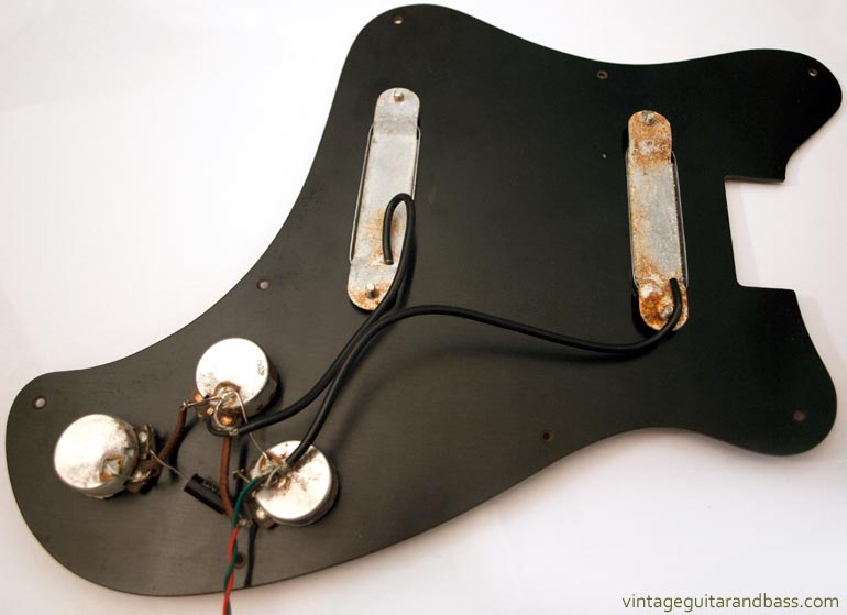 Early black scratchplates do seem to be subject to discoloration. The reverse of this guard is considerably blacker than the 'greyed' front. Pickups are both