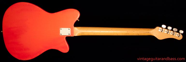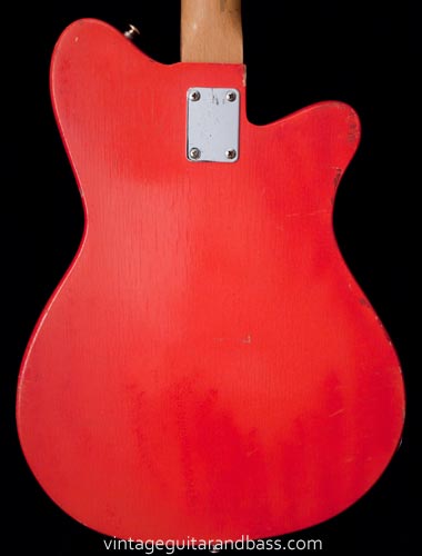 This example, like most early Vox instruments, has a laminate wood body, and a very thin one at that - just 15/16". Compare this to a later, 1965 example, that has a pretty nice solid mahogany body with a depth of 1 1/16". It isn't a massive difference, and they weigh the same, but that extra 1/8" gives the later example a more substantial feel, and importantly, provides that bit extra room for a front-mounted output jack.