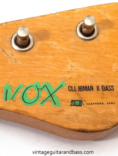 The front of the headstock with JMI green Vox decal, typical of early UK Vox production. The decals on these early UK Vox guitars were never hard-wearing, but this one has lasted better than most. The text gives model designation and describes the location of manufacture: Dartford, Kent. Interestingly, the model is described as Clubman II bass - suggesting the existence of a (single pickup) Clubman I bass. In fact the equivalent guitar model was widely shipped as a Clubman I and II (see a 1963 Clubman II guitar) but the bass was almost exclusively dual pickup. No doubt small numbers of Clubman I basses were produced, but even as early as 1962 the bass was being described in Vox literature simply as 'Clubman bass' with two pickups listed as standard. See the 1962 Vox catalog which describes Clubman I and II guitars, and although it mentions single and dual pickup basses, only use the name 'Clubman bass'.