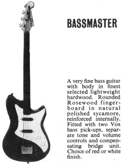The Vox Bassmaster was one of Vox's earliest guitars, and probably their first bass. It was first advertised (alongside the Vox Contour bass, in December 1960). Vox guitar manufacture was in it's infancy, and unlike Vox amps, the first guitars were primarily aimed at entry level guitarists who were into the Shadows (one of the earliest British guitar bands who endorsed Vox amps, yet played Fender guitars). Short scale (30") and a thin neck made them ideal for younger hands. The Bassmaster was a loose Fender Precision copy, but smaller, and more economically manufactured. They were produced from late 1960 until at least early 1966. They were manufactured in the UK, the necks outsourced to furniture manufacturer G-plan with the electronics and assembly taking place at the JMI plant in Dartford.