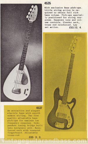 The 4537 is shown here in the 1969 Dallas Arbiter catalogue. It was listed alongside the Clubman, Bassmaster and, as seen here, Mark IV bass. These guitars typically have no Vox headstock decal, or serial number, but often featured Vox engraved hardware.