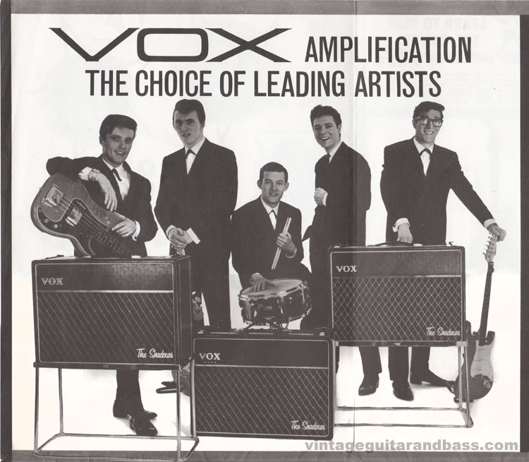 Vox amplification - the choice of leading artists. This page shows an early 1960s line-up of British band, the Shadows, who were Vox's biggest endorsers at the time. From left to right: Jet Harris, Bruce Welch, Brian Bennett, Cliff Richard and Hank Marvin. This line up of the band was only in existance from October 1961 (when Bennett replaced Tony Mehan), and April 1962 (when Jet Harris was replaced by Brian Locking).