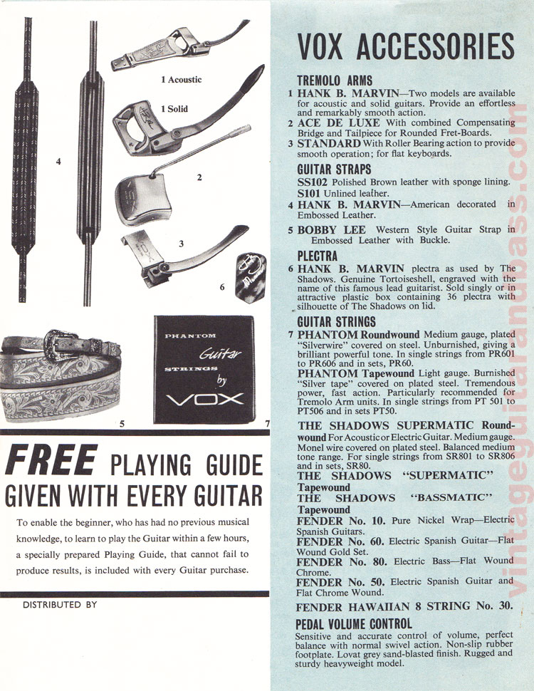 The back panel of the 1963 Vox catalogues showed a number of Vox parts and accessories: tremolos (the Hank B. Marvin, Ace De Luxe and Standard), straps (Hank B. Marvin and Bobby Lee), plectra (Hank B. Marvin), and strings by Vox and Fender.