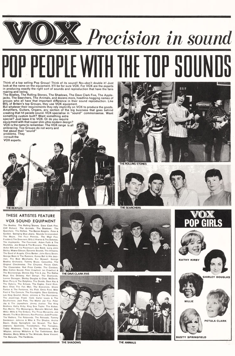 1964 Vox guitar, bass and amp catalog front cover. Although primarily a guitar and amplifier catalog, the cover gives the impression of a typical mid 1960s newspaper-style music publication, with pictures of "Pop people with the top sounds": The Beatles, The Rolling Stones, The Searchers, The Shadows, The Dave Clark Five, The Animals, Kathy Kirby, Shirley Douglas, Millie, Petula Clark and Dusty Springfield.