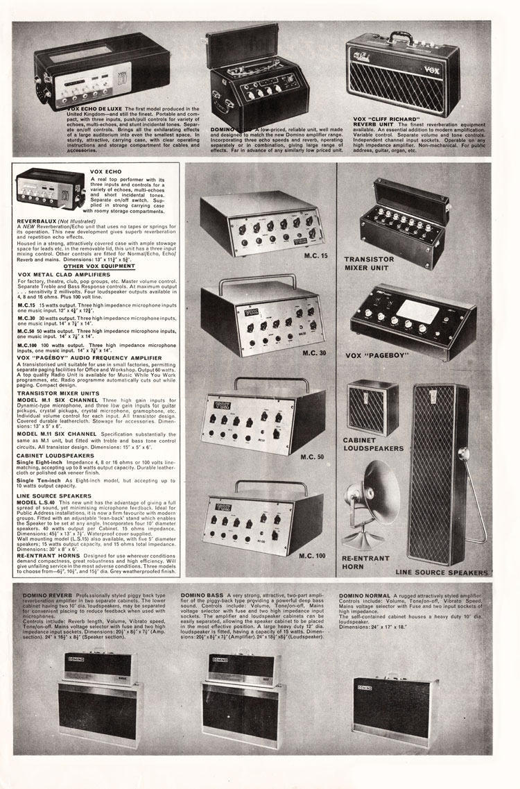As well as guitars and amplifiers Vox made echo and reverb units: Vox Echo, Vox Echo deluxe, Vox Reverbalux, Domino Echo; Metal Clad (MC) amps: MC15, MC30, MC50, MC100, and Domino branded amplifiers: Domino Normal, Domino Reverb and Domino Bass.
