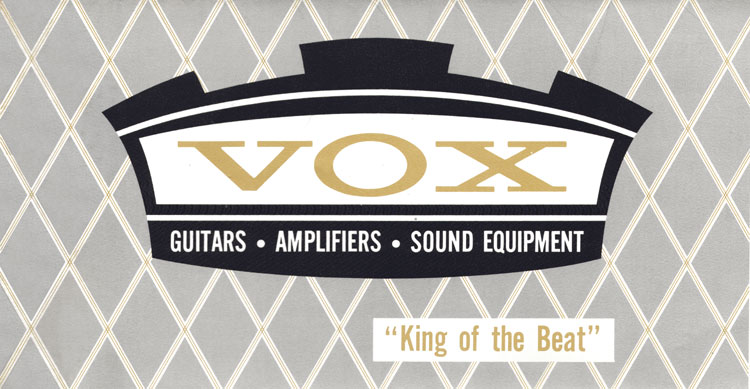 1965 Vox guitar, amplifiers and sound equipment catalog, front cover. The gold Vox logo is inside a crown motif, to accompany the 'King of the Beat' title - all over the Vox diamond grille cloth pattern. Vox - guitars, amplifiers, sound equipment.