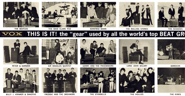 The list of Vox endorsers was pretty much a who's who of mid sixties British (and a few American) musicians. On this page: The Beatles, Dave Clark Five, Manfred Man, The Rolling Stones, The Shadows, Peter & Gordon, Sir Douglas Quintet, Gerry and the Pacemakers, Long John Baldry, Donovan, Billy J Kramer and the Dakotas, The Standells, Freddie and the Dreamers, The Hollies and The Kinks.