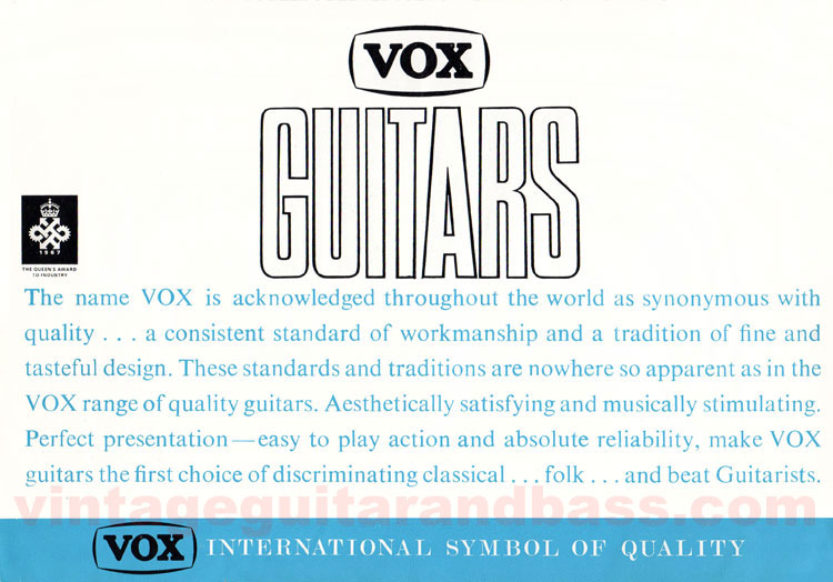 The name VOX is acknowledged throughout the world as synonymous with quality... a consistent standard of workmanship and a tradition of fine and tasteful design. These standards and traditions are nowhere so apparent as in the VOX range of quality guitars. Aesthetically satisfying and musically stimulating. Perfect presentation - easy to play action and absolute reliability, make VOX guitars the first choice of discriminating classical... folk ...and beat Guitarists.