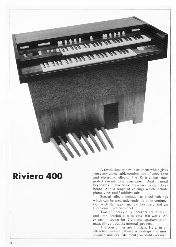 A revolutionary new instrument which gives you every conceivable combination of voice, tone and electronic effects. The Riviera has integrated circuit tone generators. Dual manual keyboards. 8 harmonic drawbars to each key-board. And a range of voicings which include piano, vibes and 3 additive tabs. Special effects include sustained voicings which can be used independently or in conjunction with the upper manual keyboard and an Electronic Gyrotone effect. Two 12" heavy-duty speakers are built-in, and amplification is a massive 100 watts. An extension socket for Gyrotone speakers automatically cuts out the internal speakers. The possibilities are limitless. Here, in an attractive walnut cabinet is perhaps the most complete musical instrument you could ever own.