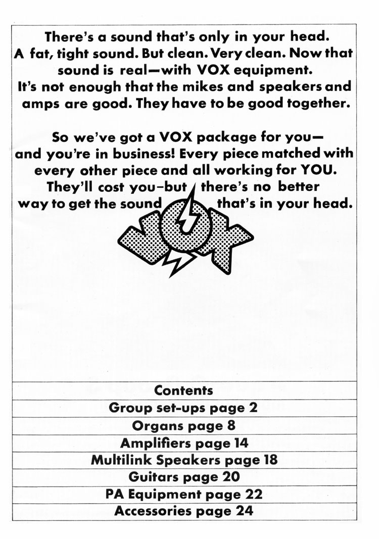 There's a sound that's only in your head. A fat, tight sound. But clean. Very clean. Now that sound is real - with Vox equipment. It's not enough that mikes and speakers and amps are good. They have to be good together. So we've got a VOX package for you - and you're in business! Every piece matched with every other piece and all working for YOU. They'll cost you - but there's no better way to get the sound that's in your head