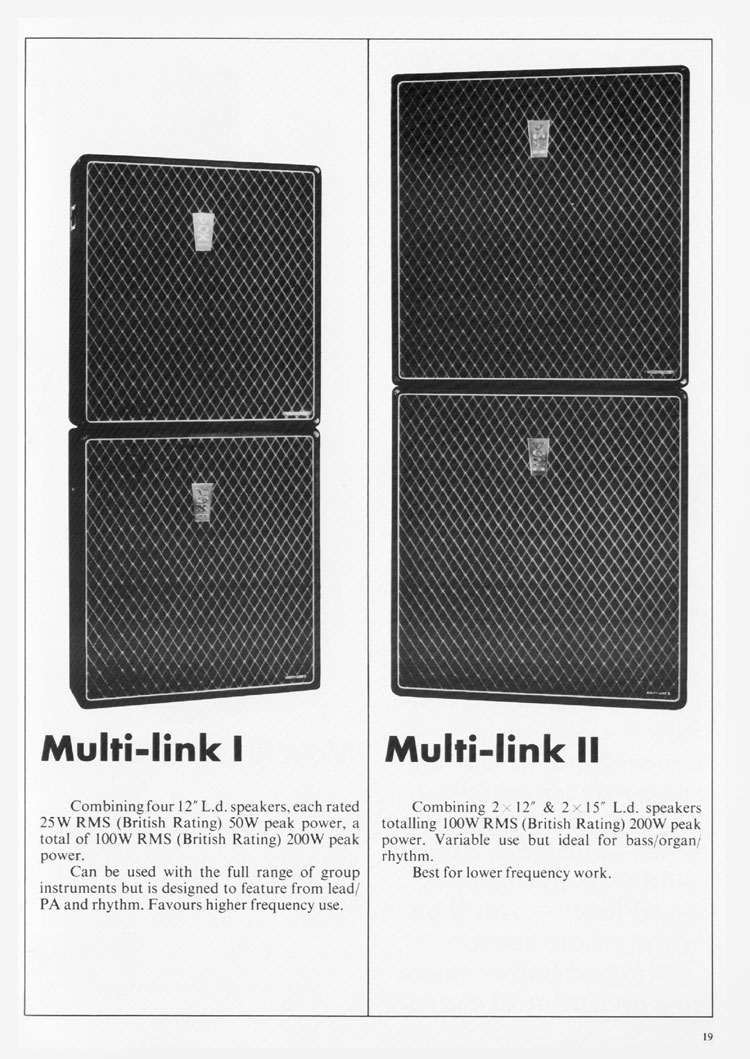 Details of the Multi-link I (for 'higher frequency use') and Multi-link II (for 'lower frequency work') speaker cabinets.