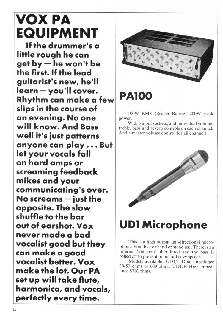 If the drummer's a little rough he can get by - he won't be the first. If the lead guitarist's new, he'll learn - you'll cover. Rhythm can make a few slips in the course of an evening. No one will know. And Bass well it's just patterns anyone can play... But let your vocals fall on hard amps or screaming feedback mikes and your communicating's over. No screams - just the opposite. The slow shuffle to the bar out of earshot. Vox never made a bad vocalist good but they can make a good vocalist better. Vox make the lot. Our PA set up will take flute, harmonica, and vocals, perfectly every time.