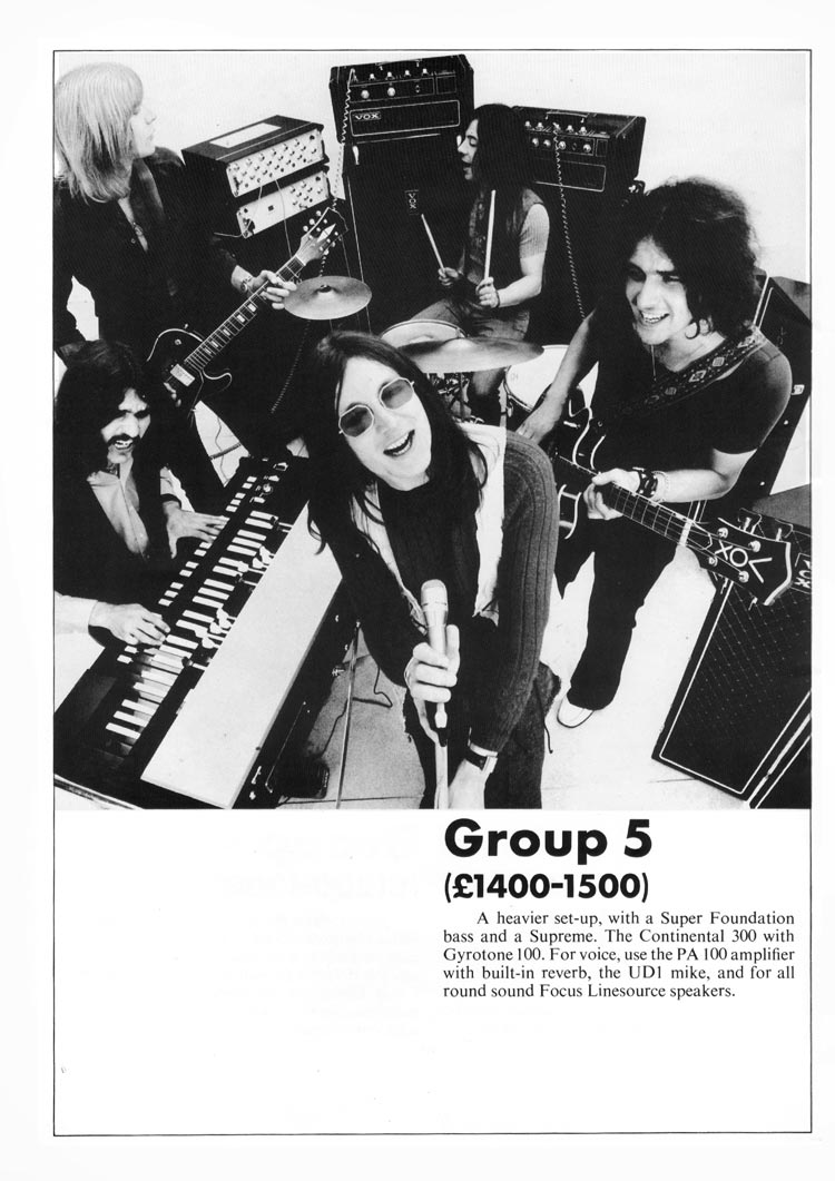 Vox 1970 full line catalogue page 5. The heavier 'group set-up' shown here includes the Vox Foundation bass amplifier, Supreme guitar amplifier, Vox Continental 300 with Gyratone 100, PA-100 and Reslo UD1 microphone.