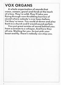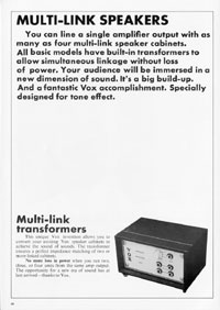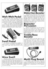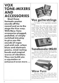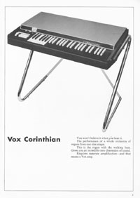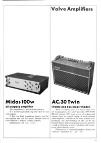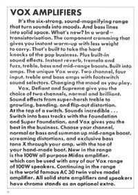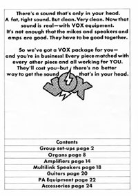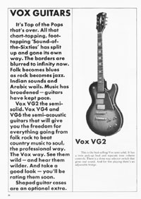 The 1970 UK Vox catalogue was the first (and only) catalogue issued by Vox Sounds Ltd, under the ownership of the Corinthian Bank. They bought the company after the Royston Group went into liquidation in 1969, and rather than stock Italian guitars made at the E.M.E factory in Recanati, they soon changed to a range of Japanese models. Oddly, a good proportion of the catalogue is dedicated to group set-ups; they clearly intended to outfit entire bands in one go. This catalogue features the following guitars, basses, organs and amplifiers.