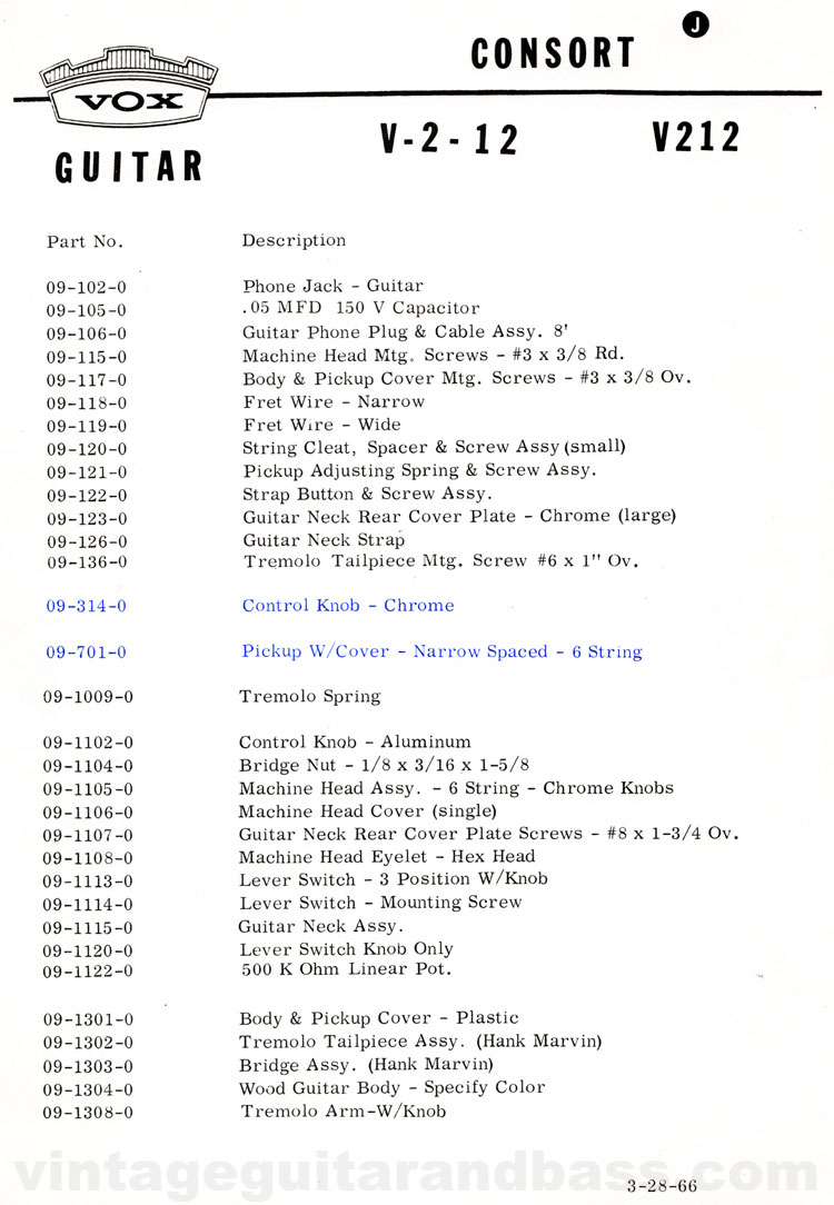 The Vox Consort guitar was one of the higher-end British-built (JMI) Vox guitars, retailing at around four times the price of the cheapest (the Stroller) - and comparatively rare today. The parts list reproduced below was produced in March 1966 by the Thomas Organ Co, for dealers in the US.