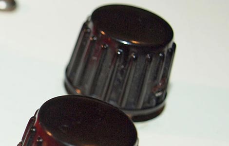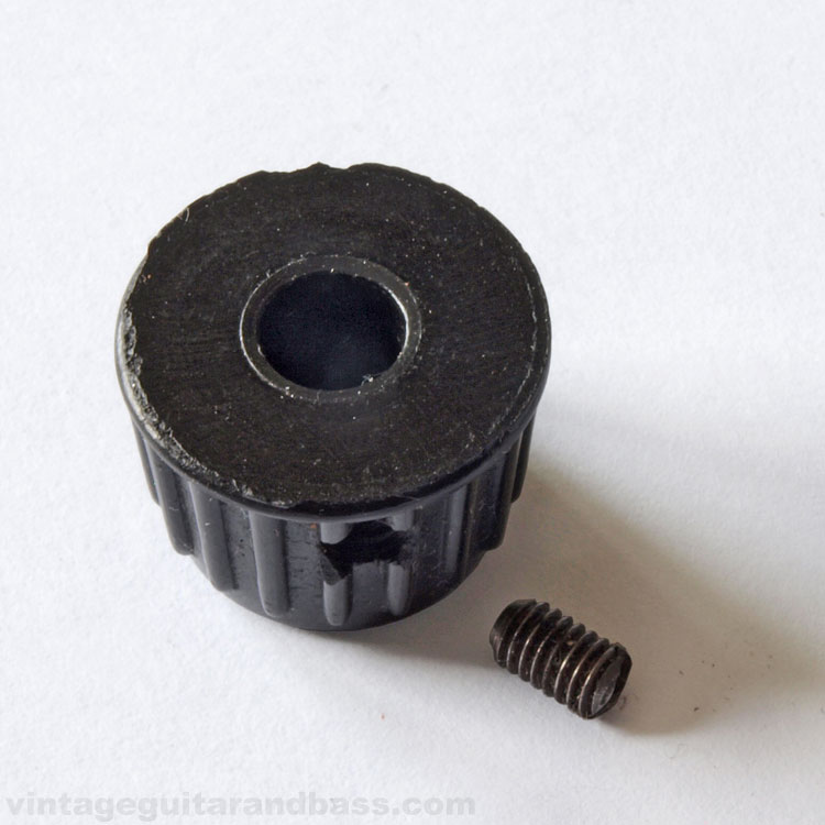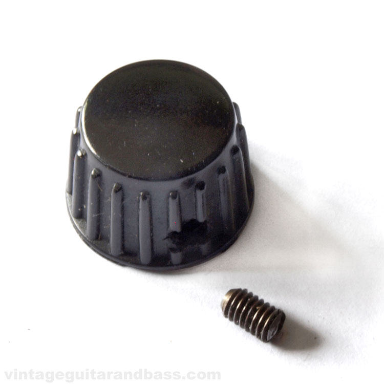 Vox black plastic control knob, part number 09-703-0, used for volume and tone controls on JMI-made Vox guitars from 1962 until at least 1965 - typically on three-pickup guitars such as the Dominator, later versions of the Shadow, the Super Ace and Apache. These are all guitars made in the United Kingdom; Italian Vox guitars didn't use them. Later examples of these guitars were generally fitted with the metal control knobs.