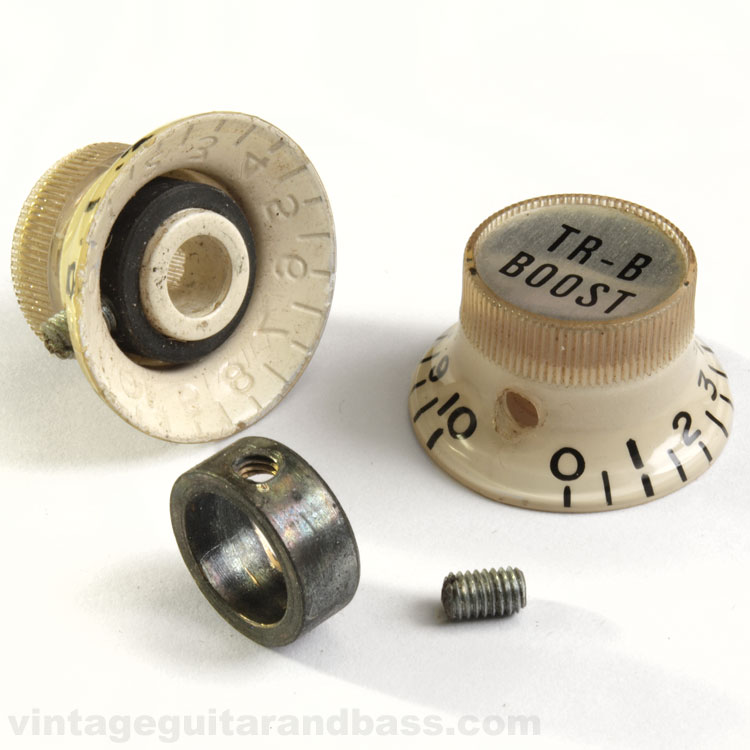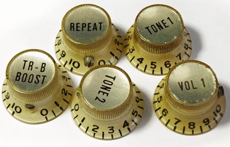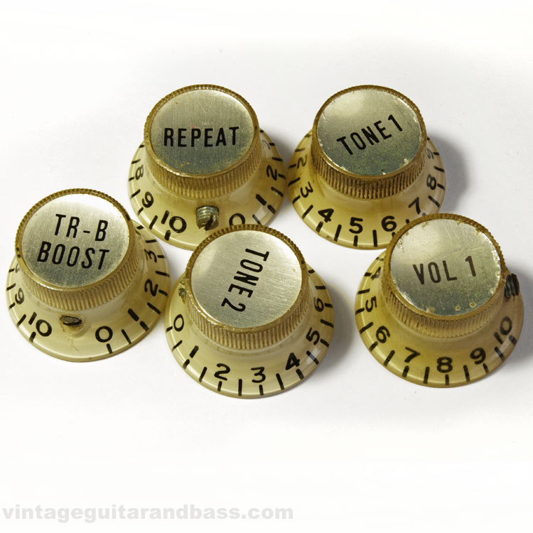 As demand for Vox guitars grew, particularly in the United States, a new enterprise between JMI, Eko and the Thomas Organ Company (the US distributors) was established - this was named EME, and like Eko was based in Recanati in Italy. EME guitars were widely fitted with electronic effects, and controls were labelled as such: distortion (dist), repeat percussion (repeat), treble/bass boost (tr-b boost), aswell as the standard volume and tone controls. The knobs were somewhat similar to the bell knobs used by Gibson in the 1950s and 60s, with a silver coloured metallic insert, and numbered 1-10.