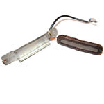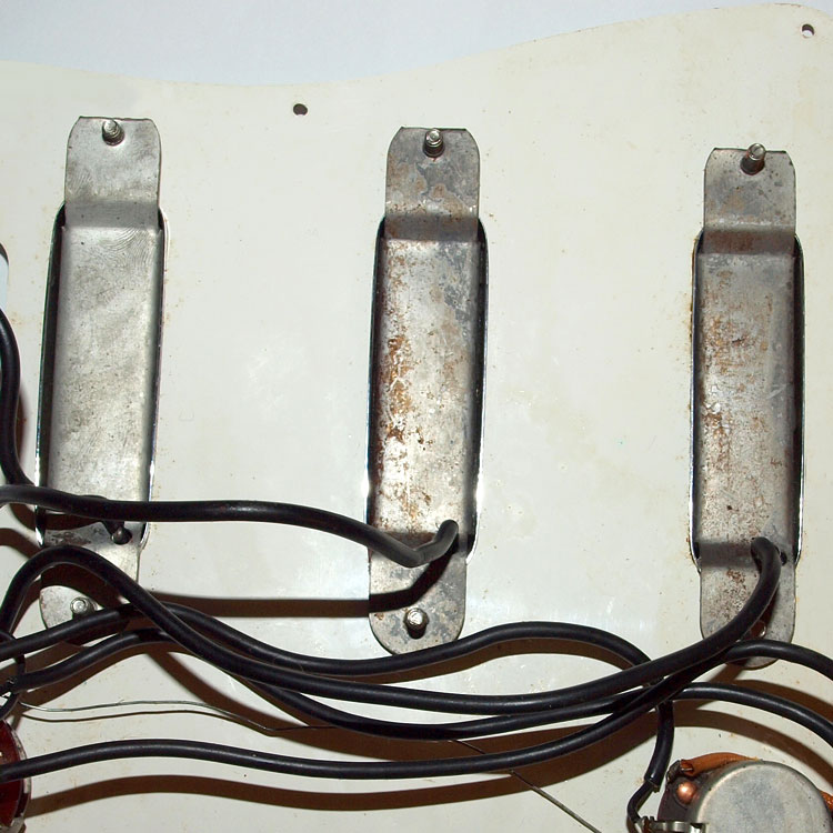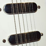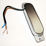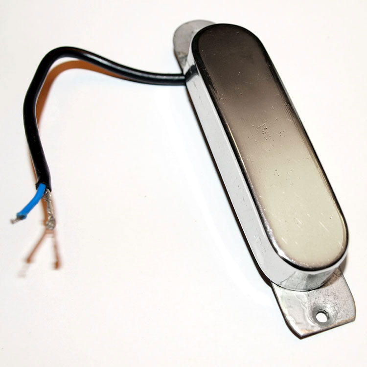 The Vox V1 pickup was very widely used throughout the 1960s, from late 1960 right through to the company's demise in the UK in 1967. It was a simple, but highly effective design. The bassplate is made from pressed aluminium. Compare this to the very earliest pickup used by Vox here - the coil and magnet arrangement is broadly similar, however the bassplate/mounting tabs are constructed quite differently. The pickup bass plate is 100mm long, with a distance between mounting holes of 88mm. This is a really simple pickup: a single coil, wrapped in waxed cloth, around a central magnet. The chrome cover just pushes on. The bassplate holes are threaded for the mounting screws; the springs act as spacers between the bassplate and scratchplate. Note the engraved VOX logo that adorned many (but by no means all) of the chrome covers that JMI used on UK Vox guitars.