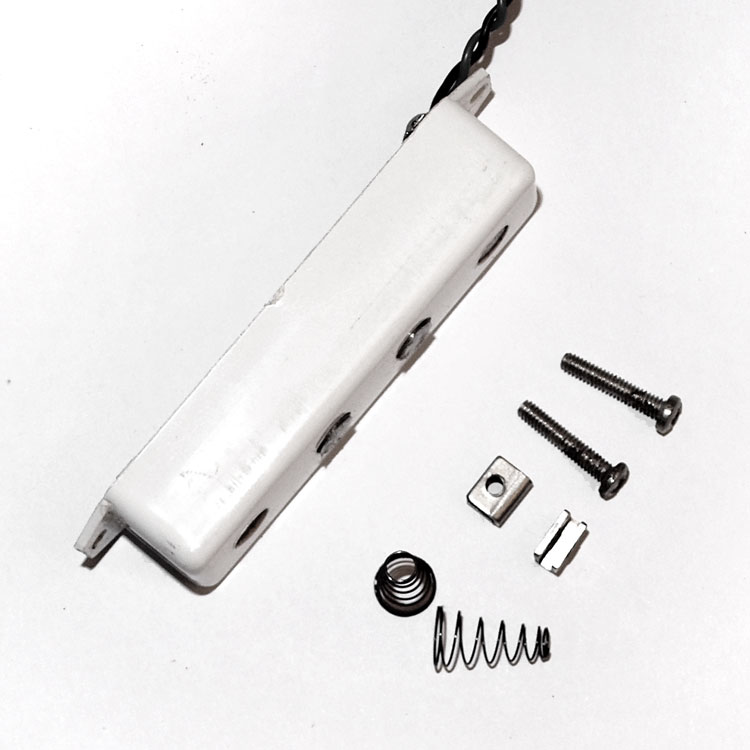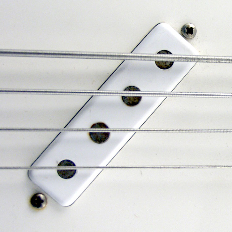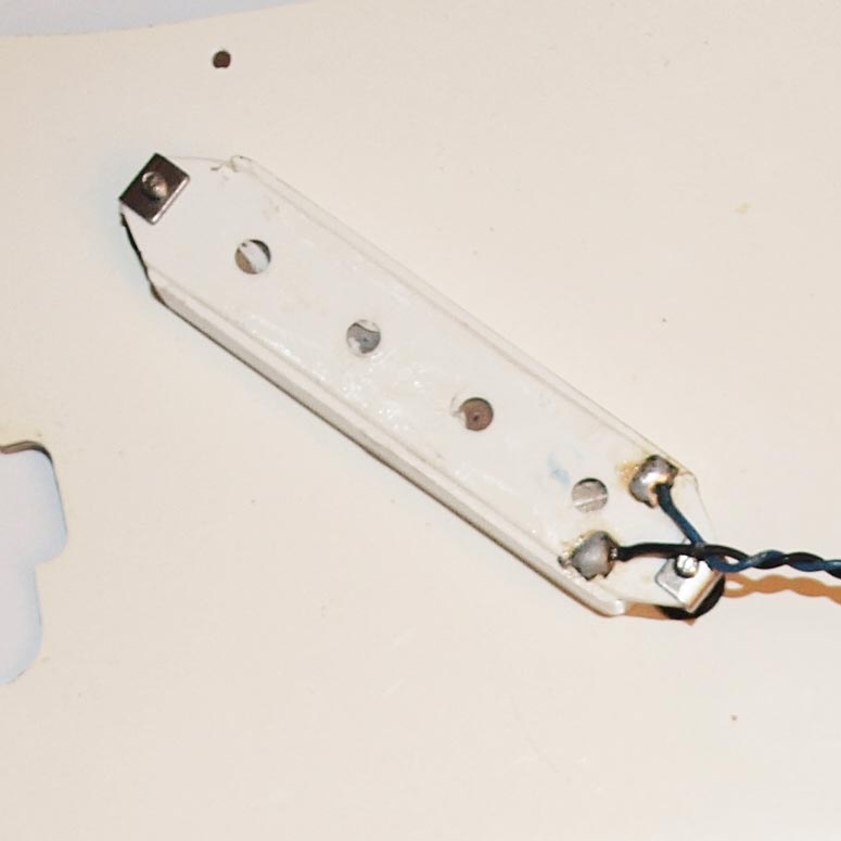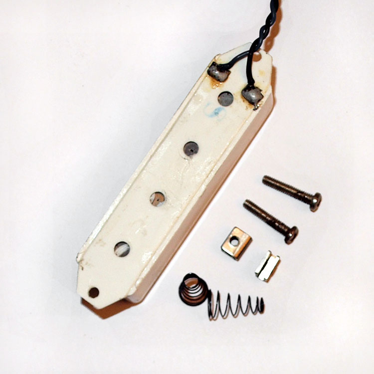 This Vox bass pickup is positioned at an angle on Eko-produced ( Italian-made) Vox basses, the Vox Panther, Phantom IV and Mark IV bass guitars. On the Panther, it was positioned at an angle: slanted forwards in this case, but also backwards in some instruments. It is scratchplate-mounted, and height adjustable, but with no surround. Two metal clips slide onto each pickup mounting tab, and it is these that are threaded to take the mounting screws. This Vox bass pickup is a sealed unit; easy examination of the coils is not possible. The leads are soldered to tabs on the underside of the plastic pickup casing