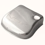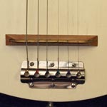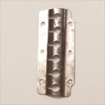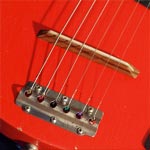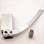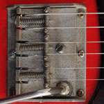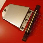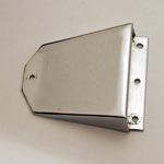 The Vox 'hump' tailpiece (our name), was derived from the Guyatone tailpiece fitted to a number of late 1950s imported guitars, including the SB series. JMI's version was used on the early Vox Stroller and Vox Shadow guitars (those based on the 50s Guyatones) and also the one and two pickup Vox Clubman. This part was replaced by the 'wedge' tailpiece below in 1966.