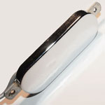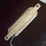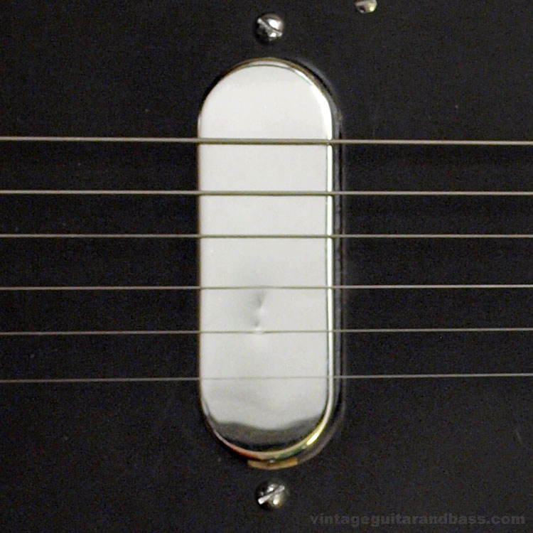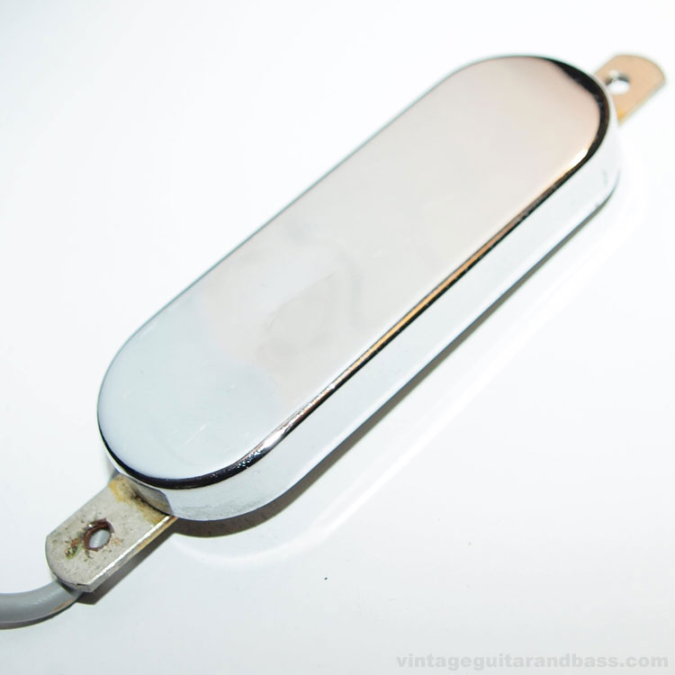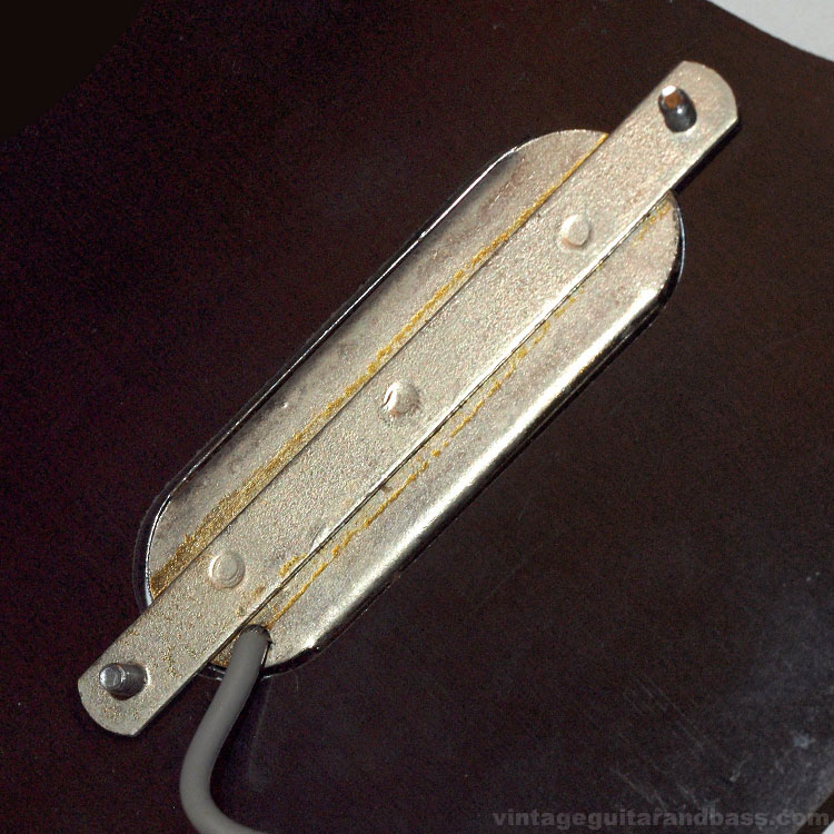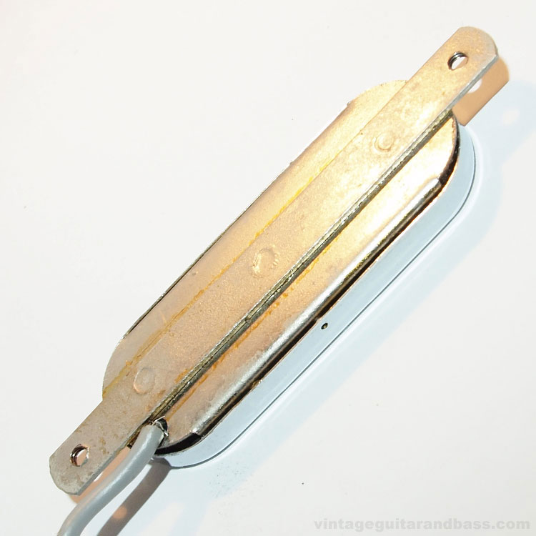 Fitted to a very early 1960s Vox Stroller. This pickup is rather similar to the slightly later Vox V1 pickups used on many UK Vox guitars, but has slightly different dimensions; whilst the V1 is made to metric measurements (20mm x 75mm), this is imperial at 1" x 3" (25.4mm x 76.2mm), but also a little shallower; the cover is slightly convex, but has a maximum depth (in the centre) of 8.4mm (1/3") - compared to 12.5mm of the V1. So this pickup is noticeably wider and a shade longer. Also, a lot (but by no means all) of V1 pickups had a Vox logo; these late 50s/early 60s units never did.