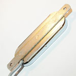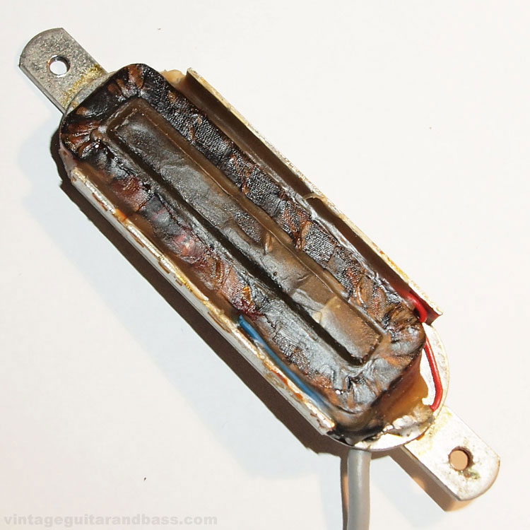 This unit also appears on early British guitars by other manufacturers: who actually produced these pickups is not clear. The height of the pickup cover is 5/16" giving a total height of 3/8". Although this pickup and the later Vox V1 are broadly similar in construction, there are some differences: the V1 has a shaped, one-piece baseplate that includes mounting tabs, whilst these pickups have a separate bar attached to the bottom. The distance between mounting holes is approximately 88mm on both pickups however. The pickup is mounted to the scratchplate with two screws through the mounting bar. The chrome cover is not fixed to the rest of the pickup, it simple lifts off to reveal the coil below. This is really as simple as guitar pickups get. The coil of wire, covered in cloth and wax to prevent movement, is wrapped around a central magnet, the whole thing sitting upon the base-plate. This one is quite square - other examples of this pickup I have seen have far more curved corners. Compare this with the later Vox V1 that follows the same basic design.