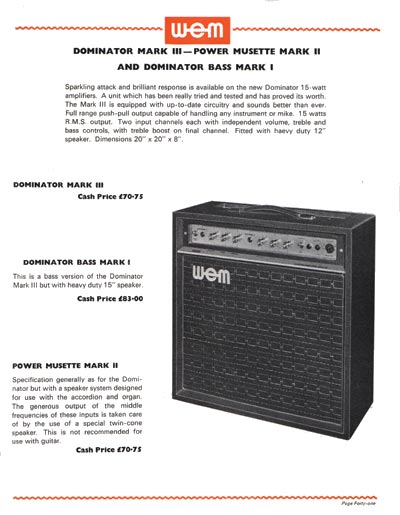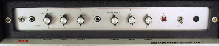 The WEM Dominator Bass MK1 bass amp was WEMs bass version of the Dominator MKIII tube amp, first available in 1972. Both were 15 watt amps, electronically identical, but the Bass had a 15" Celestion speaker (G15M, 55 Hz, 16 ohms), as used by Marshall and other British amp manufacturers.